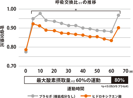 成人男性アスリートの方に、機能性関与成分であるヒドロキシクエン酸(HCA)を5日間摂取して運動をしていただき、運動中に排出された二酸化炭素と消費された酸素の割合から呼吸交換比を測定、運動中の脂肪の燃焼を高める効果があるか否か検証し、その機能性があることが判明したため、消費者庁へ研究報告いたしました。